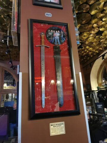 Iron Maiden‘s Bruce Dickinson’s sword and leather scabbard: an actual piece owned by Dickinson, displayed with his signature. The placard notes he signed and donated it during Hard Rock’s 25th-anniversary celebration in London.