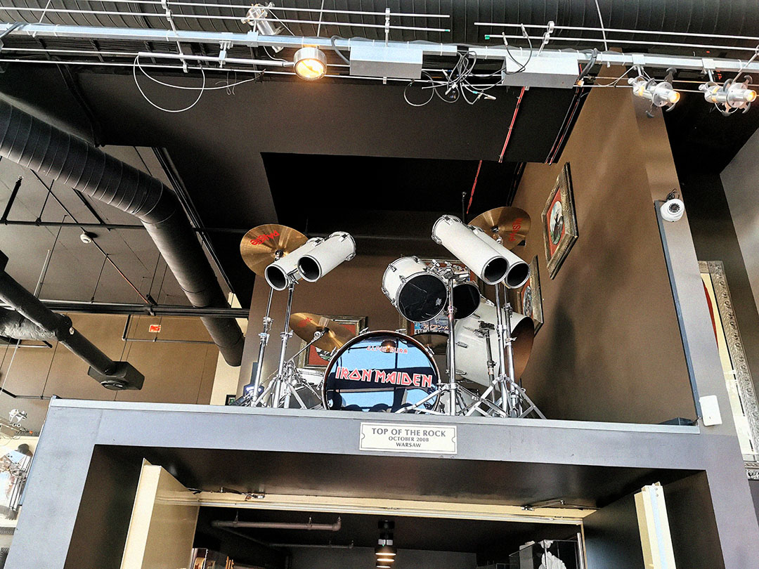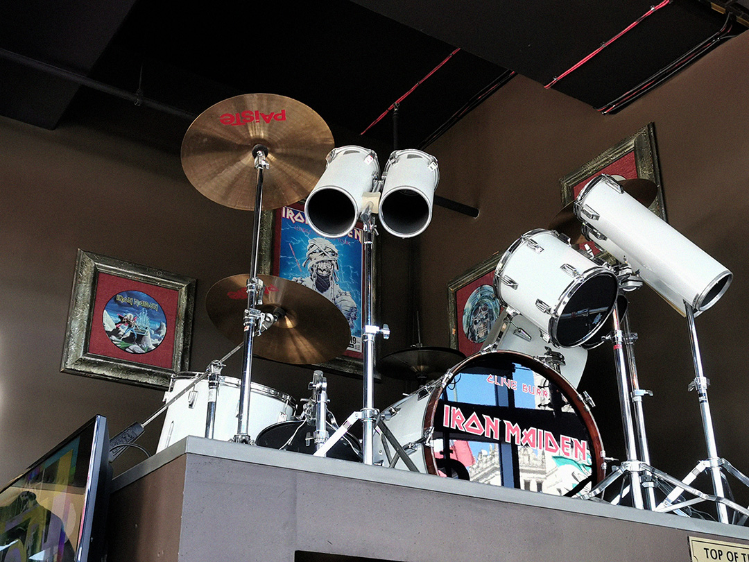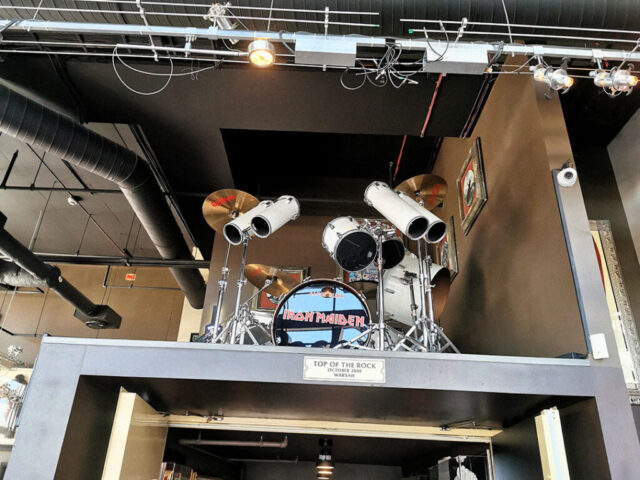 The centrepiece for metal fans is Clive Burr’s white TAMA drum kit from his Iron Maiden years, set up just inside the entrance like a shrine. Full shells with white heads in the classic early-’80s look, clearly labelled and frequently photographed—an immediate “stop and stare” item before you’ve even made it to the bar.